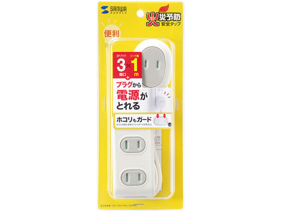 プラグにシャッター付き差込口が1個付いているので、壁のコンセントを無駄なく使えて便利です。 差込口は、ホコリ防止シャッター付きで、トラッキング火災防止やお子様のいたずら防止になります。 プラグの刃の根元にはトラッキング火災予防に有効な絶縁キャップが付いたL型プラグを採用しています。 【定格容量】:15A・125V(合計1500Wまで) 【プラグ】:2P(絶縁キャップ付き・L型プラグ) 【差込口】:2P・3個口+1個口 【コード】:VFF 1.8平方ミリメートル×2芯 【仕上がり外形寸法】:約4.2mm×7.6mm 【コード長】:1m 【本体サイズ】:W86×D44×H20.8mm
